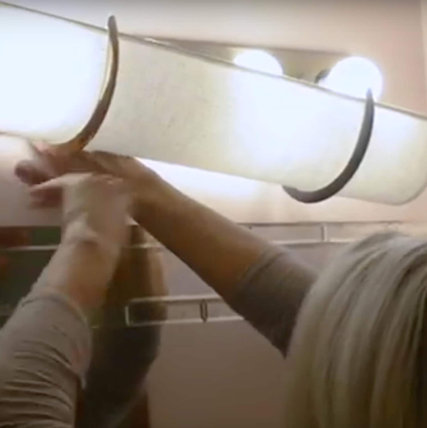 • This shows the before and after steps to install an EzLightWrap bath shade over a metal fixture to hide glaring LED bulbs. step one shows the light with mismatched bulbs, step 2 shows removing the adhesive strip on the back of the bracket Step 3 shows adjusting the bracket and step 4 shows installing the light over the strip light